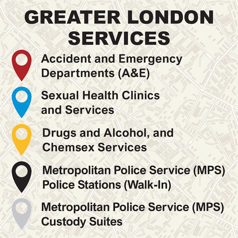 Even though there is a drive to use self-test kits, we’ve mapped 30 clinics across Greater London. - Metropolitan Police Service Stations (Walk-In)