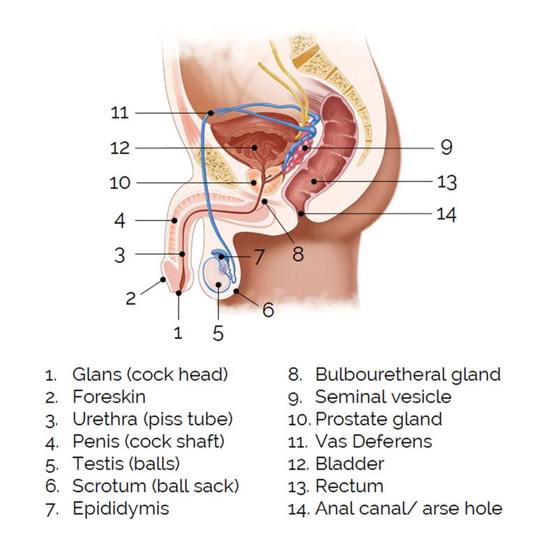 An informed working knowledge of the parts of the body used for sex can give greater control over what we do sexually, and help put sexually transmitted infections (STIs) and other problems in context. For example, did you know that pain while getting fucked is often due to the cock ‘prodding’ nerve endings at the base of your spine or sensitive arse muscles inside your body? The pain will often go if you change the position or relax the muscles.